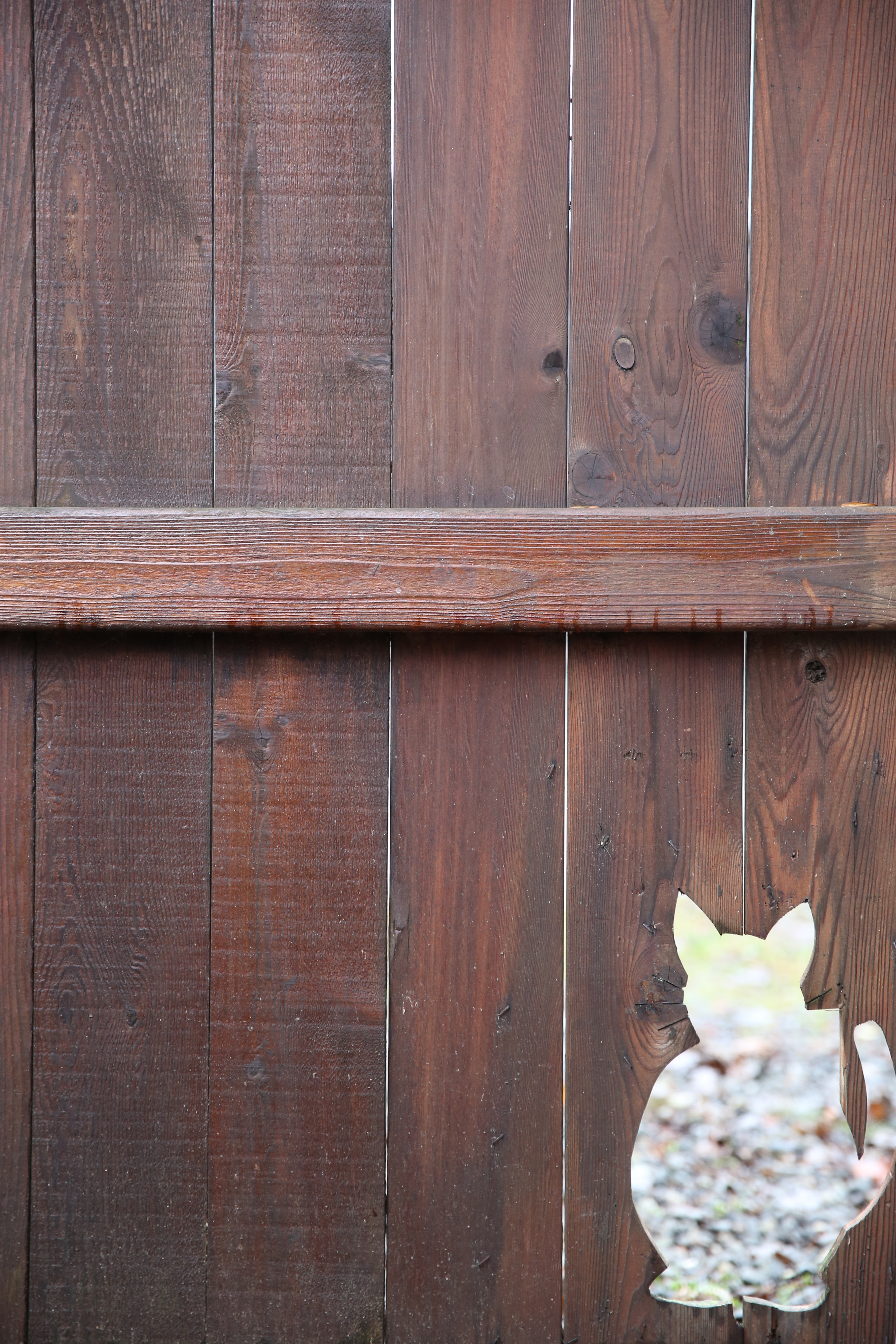A cat shaped hole in the fence welcomes the resident cat home.