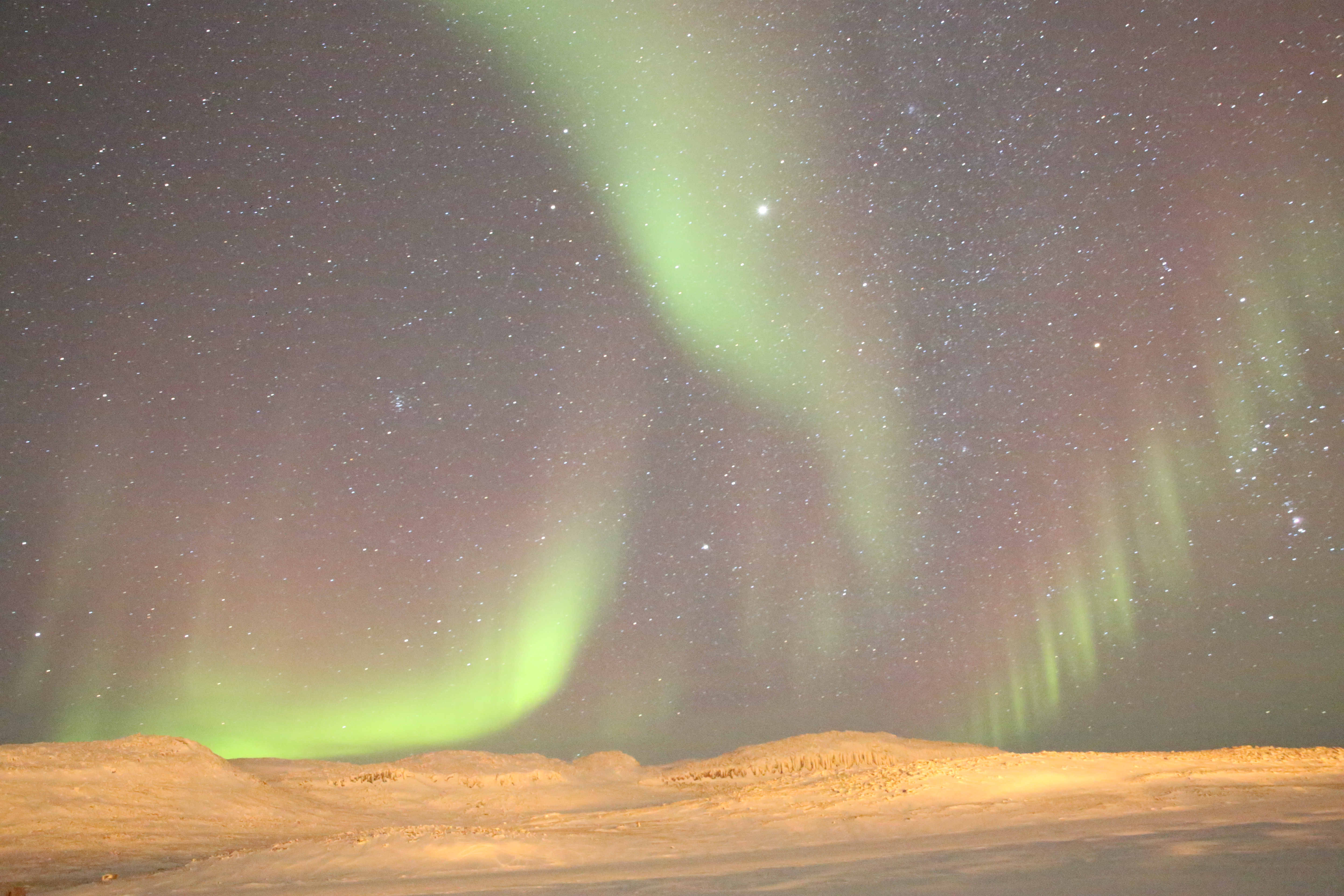 The aurora lights the sky above the hamlet of Ulukhaktok.
